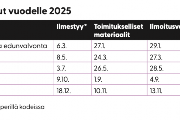 Artikkeleiden ja kuvien aineistopäivät 2026 sekä ohjeet lehden avustajille ja toimittajille